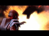 Description: Vasudan and Terran fighting, with Vasudan holding Terran pilot by head
